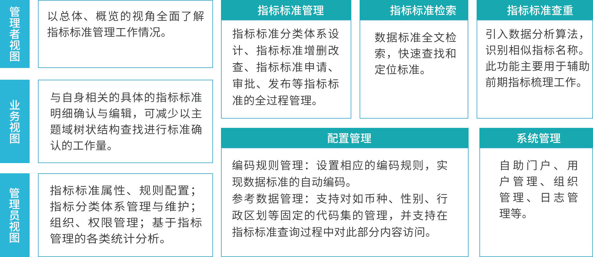管理员视图:指标标准属性、规则配置;指标分类体系管理与维护;组织、权限管理;基于指标管理的各类统计分析。