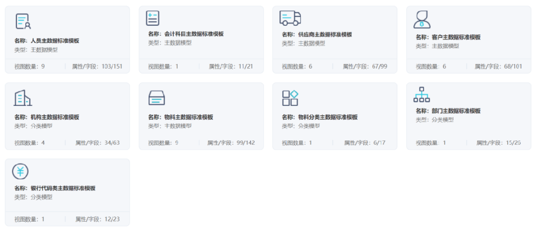 为了帮助用户在创建模型时,能够更加快捷准确地完成主数据模型的构建,睿码主数据管理平台参照现有的实施项目标准, 内置新增9个行业主数据模型模板, 提高主数据管理员模型创建效率,有效缩短项目实施周期。