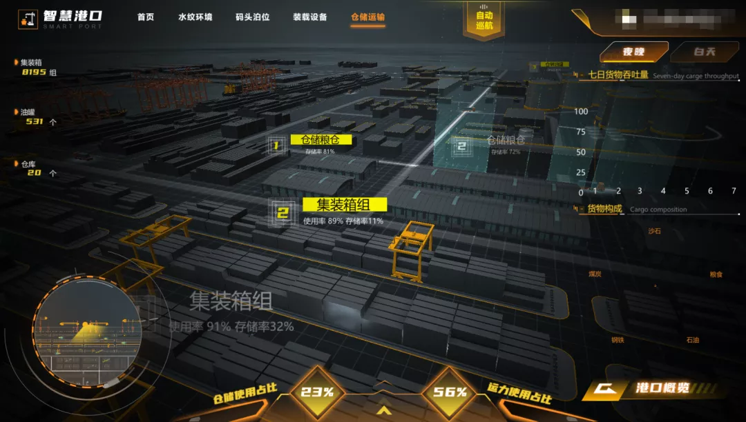 对港口区域内的仓库、油罐、集装箱等实行监管,有效协同仓储、运力的资源配置,及时掌握区域仓储能力、仓储使用率及货物存放情况,帮助港口提升运行流转效率,实现资源利用最大化。