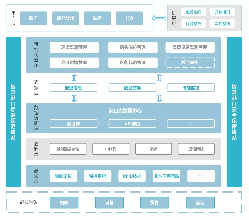 随着我国经济与贸易的不断开展,我国港口基础设施建设与技术能力已位于世界领先水平,越来越多的港口开始注重5G、物联网、大数据、云计算、智能感知等前沿信息技术,在区域范围内建立“智慧型”信息枢纽,实现功能、技术和服务的转型升级,全面构建“智慧港口”,使物与物、物与人、人与人以及港口物流的各种资源和各参与点能实现广泛地互联互通。