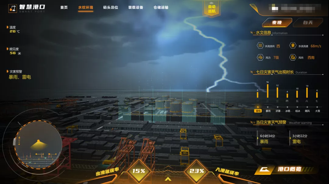 顺利获得与水文、气象部门的监测系统对接,实时掌握港口区域气象变化,附近海域的流速、水位、浪高等环境信息,有效帮助港口进行航运管理;针对恶劣气候条件,系统内置了气象模拟,增强用户可视化感知,并给予预示、预警,帮助港口尽早进行安全部署及应急预案的召开。