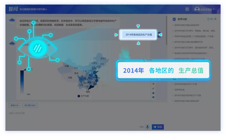 无需多言,丰富又准确的图表就好似能说话一般,智问能把你想查看的数据用最合适的图表展现出来,比如想看趋势,他会展示线状图;想要看占比情况,他会展示饼图;想看全国所有省份的某个指标对比,他会自动展示地图。如若不满意,用户还能自己输入需要转换的图表类型进行转换。