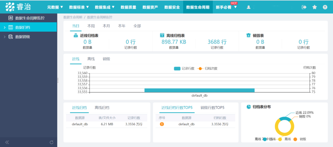 数据生命周期记录数据从创建和初始存储,到它过时被删除的整个流动过程,对数据进行近线归档、离线归档、销毁和全生命周期监控。