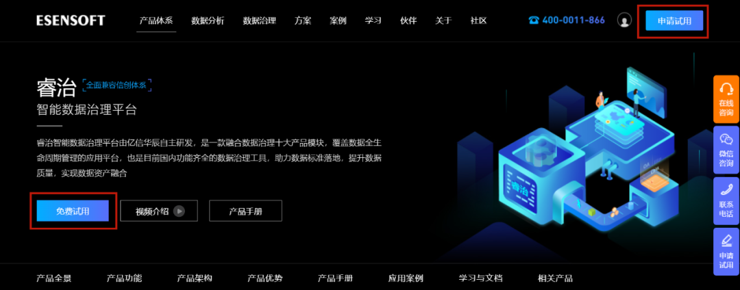 免去繁琐的安装部署,只需点击【免费试用】,注册登陆官网账号,即可免费试用睿治