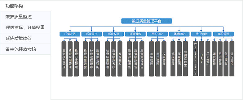 数据质量管理以数据标准为数据检核依据,以元数据为数据检核对象,顺利获得向导化、可视化等简易操作手段,将质量评估、质量检核、质量整改与质量报告等工作环节进行流程整合,形成完整的数据质量管理闭环。