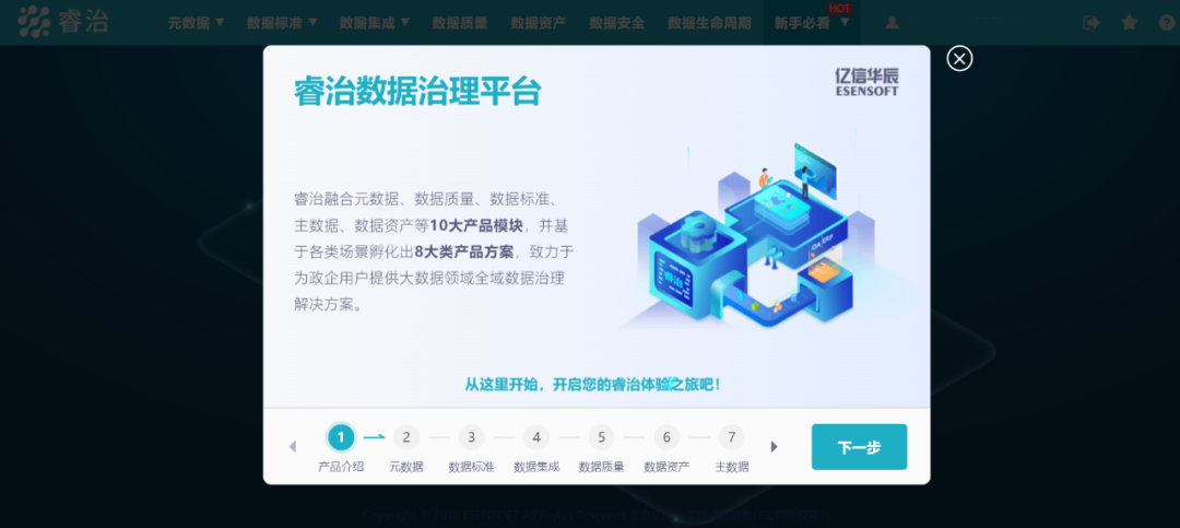 登录睿治云体验后,系统自动弹出新手引导弹窗,分别介绍数据治理各模块,还专门配套相应的学习视频,帮助快速分析学习睿治数据治理各模块功能,学习更高效。