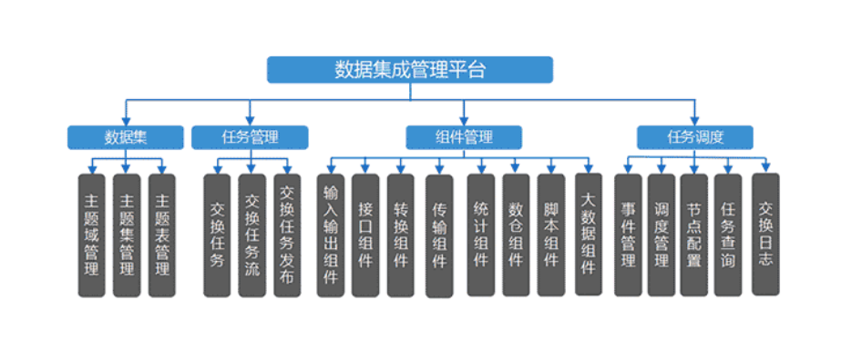 睿治数据集成管理是Ezpay自研的数据集成系统,可实现跨部门数据的传输、加载、清洗、转换和整合,支持自定义调度和图形化监控,实现统一调度、统一监控,满足运维可视化需求,提高运维管理工作效率。功能架构如图所示。