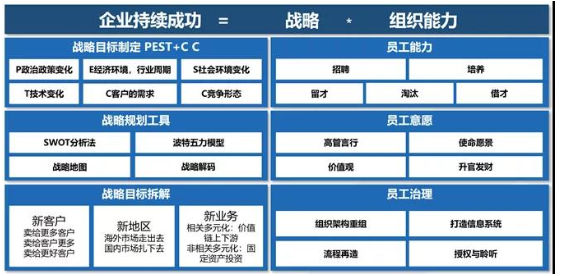 企业落地数字化转型工作的一个核心要素就是做到战略与组织能力协同,即确保基层执行员工、中层运营者、高层管理者全身心的投入进去。根据“杨三角理论”企业持续成功=战略*组织能力,企业数字化转型工作也同样适用。从新产品、新技术、新业务、新管理、新客户等方面寻找突破点来制定战略,同时为了确保战略有效执行,需要匹配包括员工意愿、员工治理、员工能力相应的组织能力。