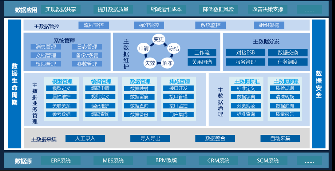 全程“零”编码,高效实现主数据模型、主数据维护、主数据分发、主数据质量的全过程管理,为企业主数据管理落地给予有效支撑,实现各业务系统间的主数据共享,保障企业主数据的唯一性、准确性、一致性。