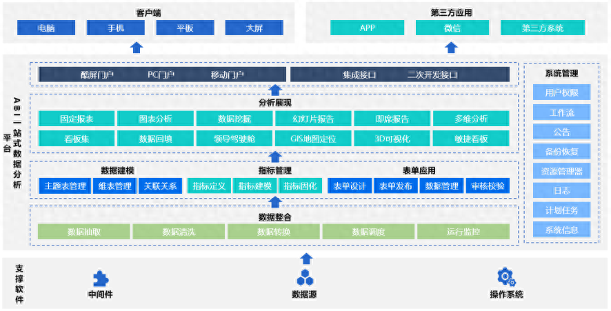 亿信ABI一站式数据分析平台。ABI(ALL in one BI)是Ezpay深耕商业智能领域十多年,在丰富的数据分析挖掘、报表应用等经验基础上,自主研发的一款融合了ETL数据处理、数据建模、指标管理、数据可视化、数据分析、数据填报、移动应用等核心功能而打造的全能型数据分析平台。亿信ABI可灵活自由地制作炫酷的图表和3D大屏可视化,方便开发和实施人员快捷地完成页面需求,真正达到了设计能走多远,展现就能达到多远的境界。亿信ABI为由北京Ezpay研发,在武汉、成都、上海多地均有服务团队支持。
